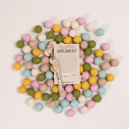 The coordinating Add-on Kit includes one skein of our favorite pearl cotton stringing thread, a needle that is just the right size for poms plus a baltic birch wood thread bobbin to keep your pearl cotton tidy. Instructions included on how to unwind the skein and make a garland. Add-on kit does not include poms.