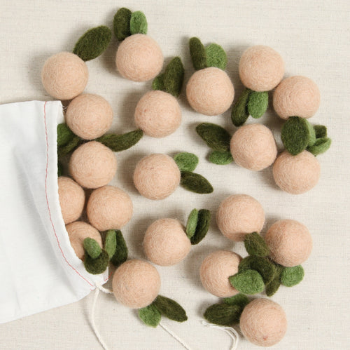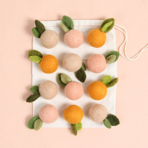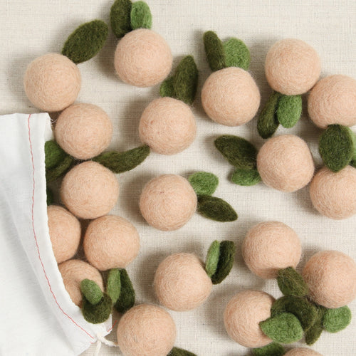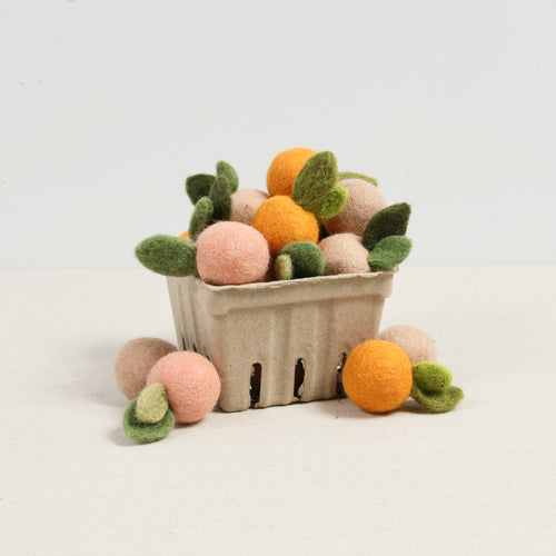 Felted fruit measures approximately 1 1/4" wide and is accented with a sprig of leaves. Hand felted. Includes six shapes.