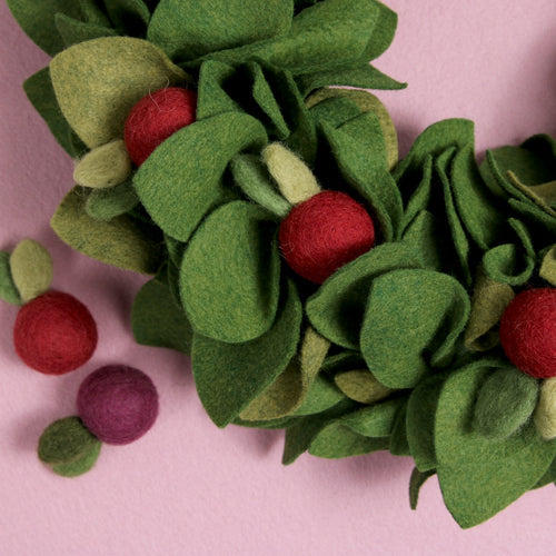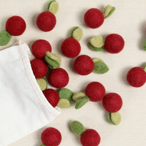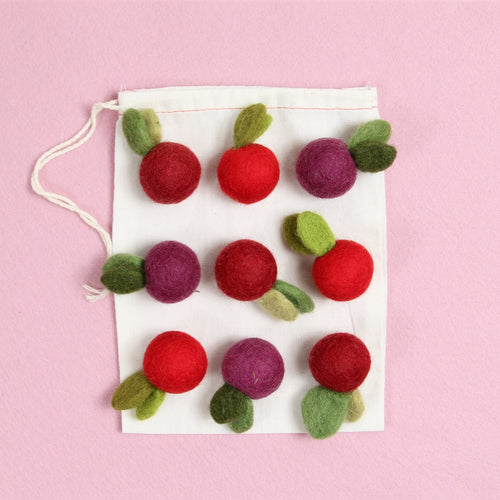 Not only does it make a lovely holiday berry, it also makes a cute garden radish! Felted fruit measures approximately 1 1/4" wide and is accented with a sprig of leaves. Hand felted. Includes six shapes.