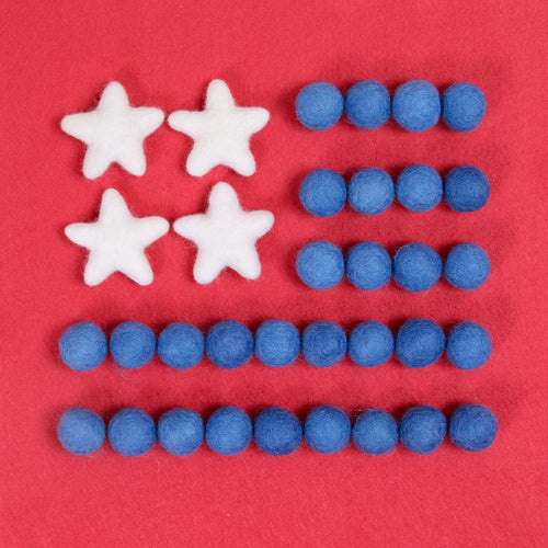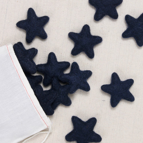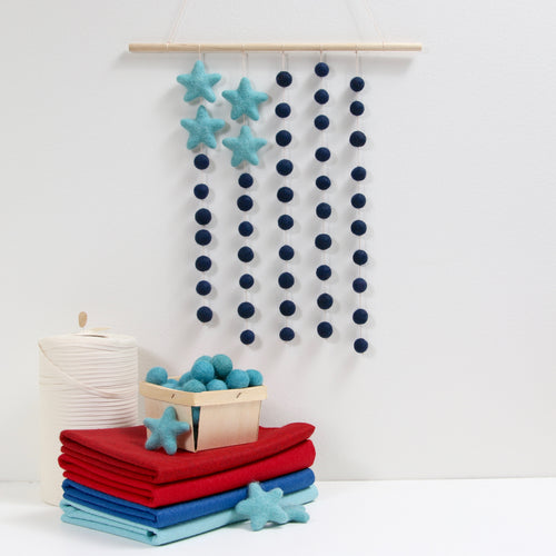 Wool felt stars shine bright! Add them to a garland, make a tassel or top a tree. Firm felted wool hearts are approximately 2" wide. Due to their handmade nature, no two are alike. Packs of 12 are discounted. The banner shown in the photo is paired with our small sized poms which are approximately 2cm wide.