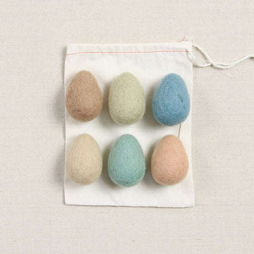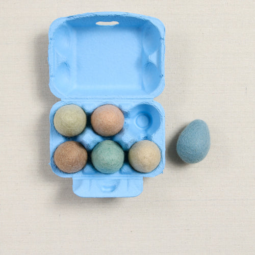 Fill your baskets with felted eggs; try your hand at needle felting or leave them as is! Firmly felted at approximately 2 1/4" - 2 1/2" inches tall. The half dozen (six) bundle includes the colors Swan, Latte, Cameo, Saltwater, Almond, Loden and comes in a paper egg carton.