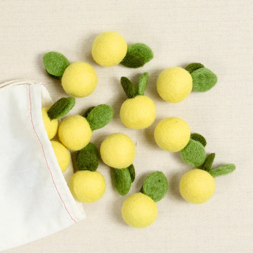 Felted fruit measures approximately 1 1/4" wide and is accented with a sprig of leaves. Hand felted. Includes six shapes.