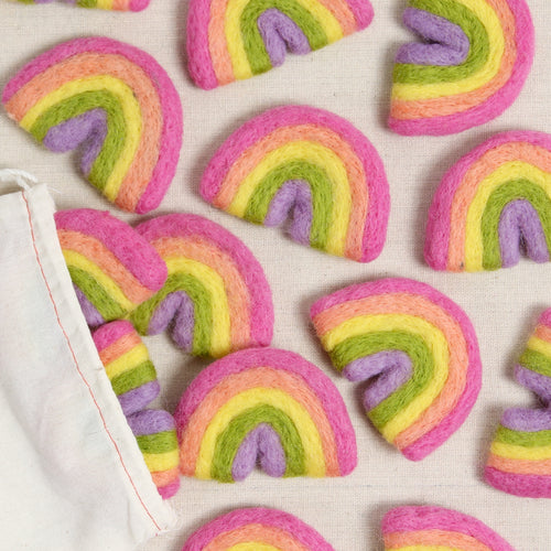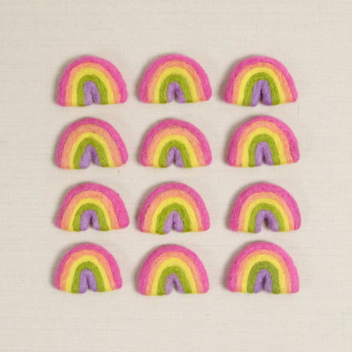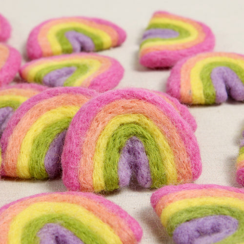 Make anyone happy with these needle felted rainbows! Measures approximately 3 x 2 1/4 inches wide by 1/2 inch thick, includes six rainbows. Grab your roving to add a needle felted cloud or purchase a premade one to match!