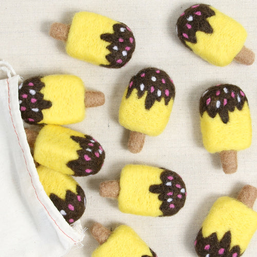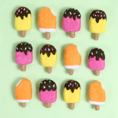 An ice cream treat that won't melt! Hand felted shapes measure approximately 1 1/2" x 3" tall. Includes one popsicle.