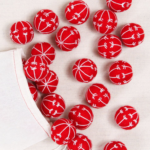 White large sized poms stitched with bright red snowflake design. Includes 12 poms total. Approximately 1 1/4" size.