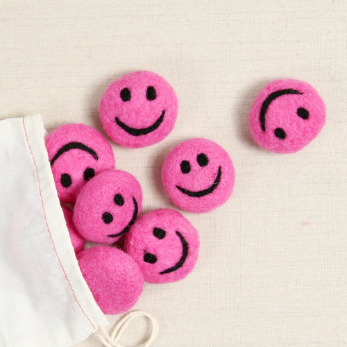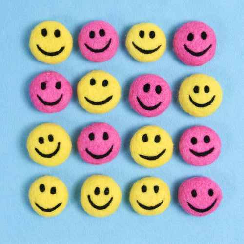 Includes one felted smiley face shape that measures approximately 2" wide.