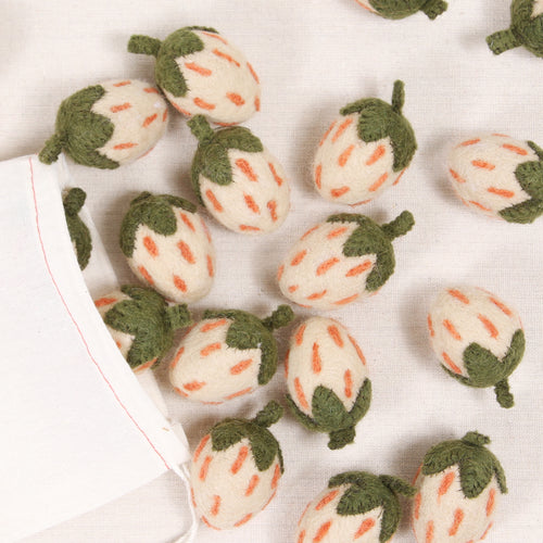 Almond strawberries are sweet enough to eat! Each handmade berry measures 2 1/2" tall (minus stem) and 1 1/2" wide. These make great garlands, gift toppers or even play food! Includes 12 strawberries.
