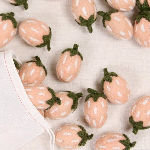Cameo Pink strawberries are sweet enough to eat! Each handmade berry measures 2 1/2" tall (minus stem) and 1 1/2" wide. These make great garlands, gift toppers or even play food!