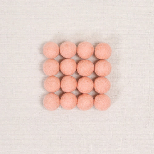 Blush pink colored felt balls. Carefully hand felted by our partners in Nepal, expect some variance in size and color. Extra Small, Small, and Medium sizes include 50 poms per bundle. Large poms include 20 poms per bundle.