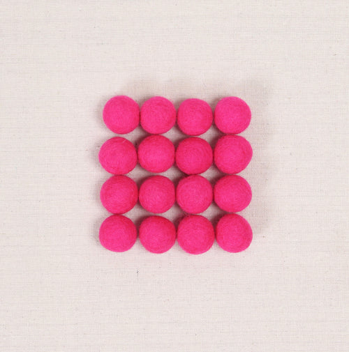Magenta felt balls. Carefully hand felted by our partners in Nepal, expect some variance in size and color. Extra Small, Small, and Medium sizes include 50 poms per bundle. Large poms include 20 poms per bundle.