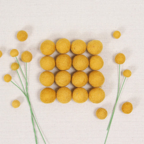 Mustard yellow felt balls. Carefully hand felted by our partners in Nepal, expect some variance in size and color. Tiny poms include 100 poms per bundle. Extra Small, Small, and Medium sizes include 50 poms per bundle. Large poms include 20 poms per bundle.