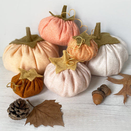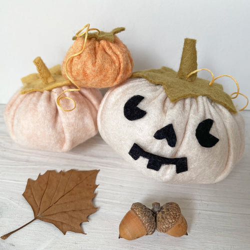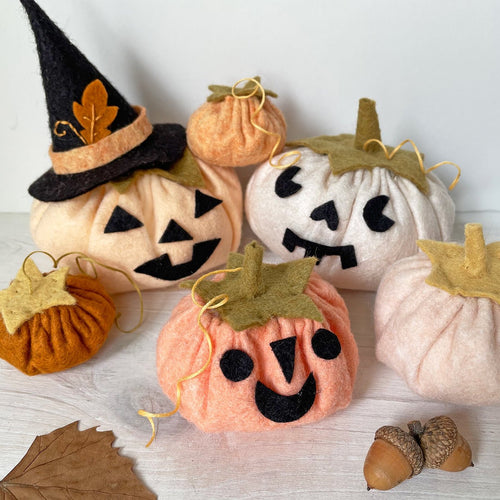 Sew a felt Pumpkin Patch with this cute and easy sewing pattern! Make a variety of pumpkins or Jack O Lanterns with spooky faces, along with a witches hat. These fun friends are a perfect addition to your Autumn or Halloween decor.