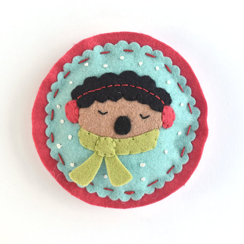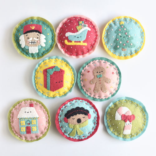 All of the ornaments follow the same basic instructions. Some have more embroidery, while some are mostly felt appliqué. Each of the 8 ornament designs (Candy Cane, Gingerbread, Caroler, Nutcracker, Sleigh, Christmas Tree, Gift, and House) has its own page of instruction which includes: