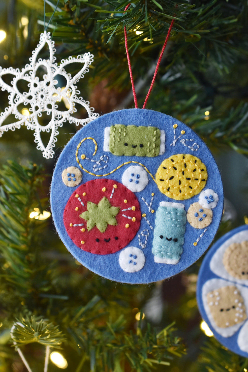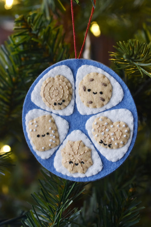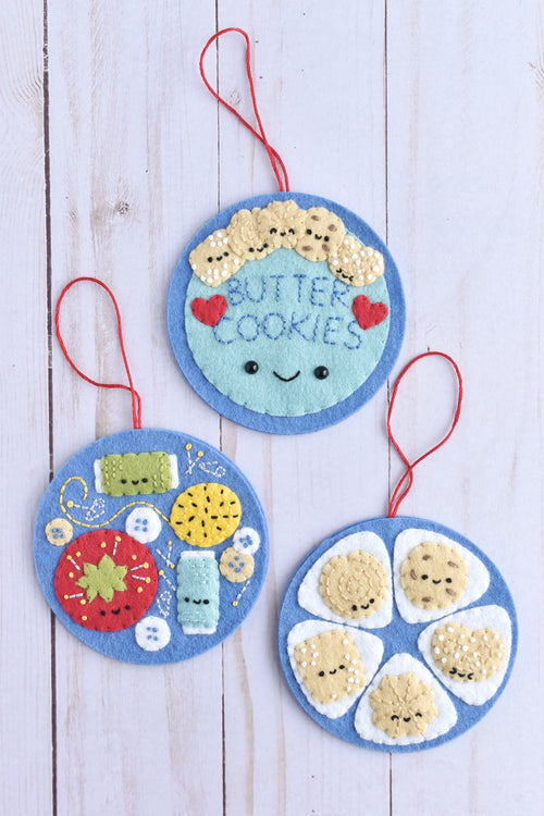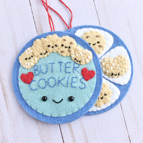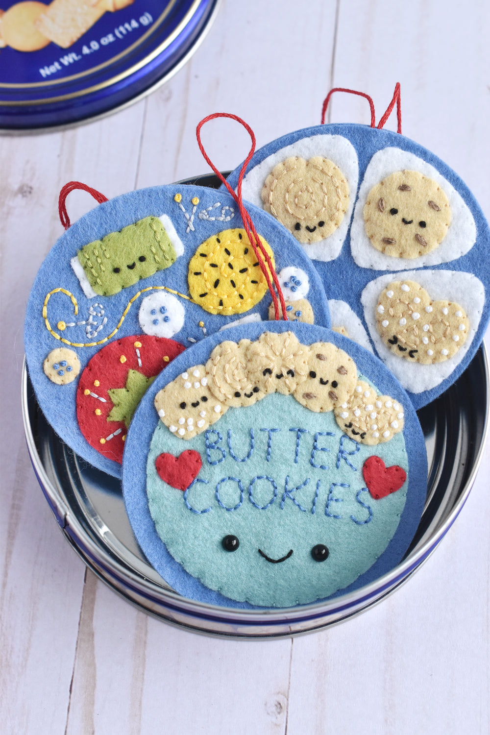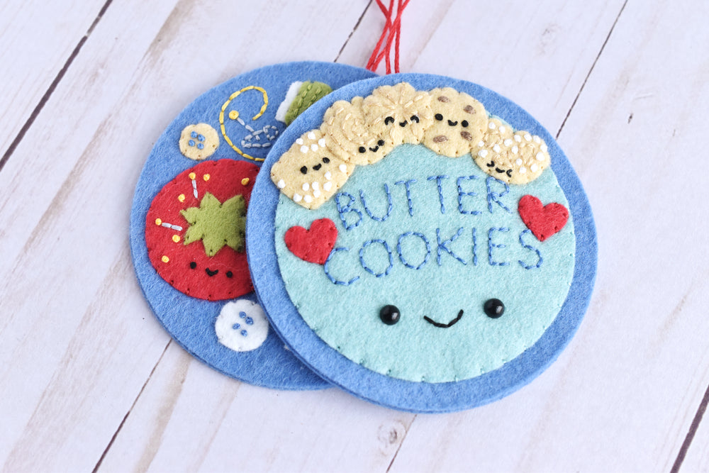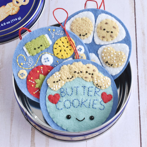 There are three felt appliqué ornament designs: the butter cookie tin lid, the cookies inside, and the sewing supplies inside. You can also make double-sided ornaments with the cover on one side and the "inside" on the back.