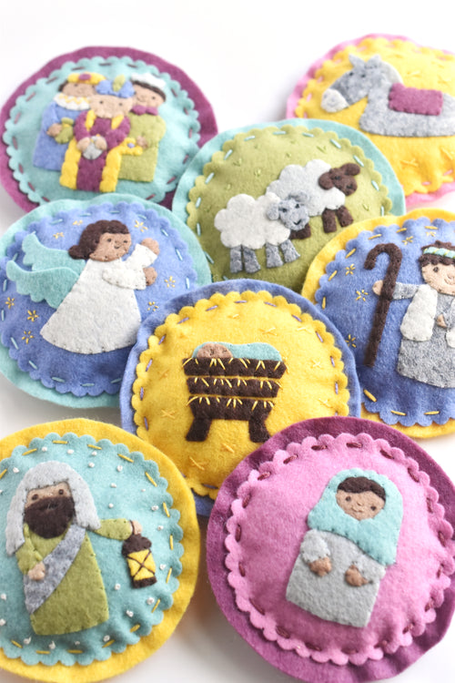 All of the ornaments follow the same basic instructions. Some have more embroidery, while some are mostly felt appliqué. Each of the 8 ornament designs (Angel, Mary, Joseph, Donkey, Shepherd, Sheep, Jesus in the Manger, and Wise Men) has its own page of instruction which includes: