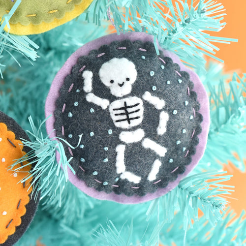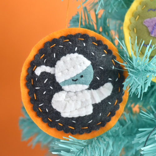 Celebrate the Halloween season with these Not-So-Spooky felt ornaments! These frightfully adorable friends are all cute and no spook! A few of the designs with small pieces may look a little scary to beginners, but there are also plenty of patterns that are extremely easy. Some hand embroidery skills are recommended. Each finished ornament measures about 3-1/2 inches across.