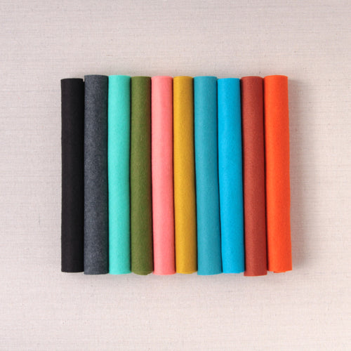 Benzie's wool blend felt in Black. Select cut sheet or yardage-multiples of 1/2 yard cuts will yield one uncut sheet. Our bolts are approximately 36" wide. Full bolts are 40% off the retail price of cut sheets. Inventory on full bolts is limited, please contact us for availability.