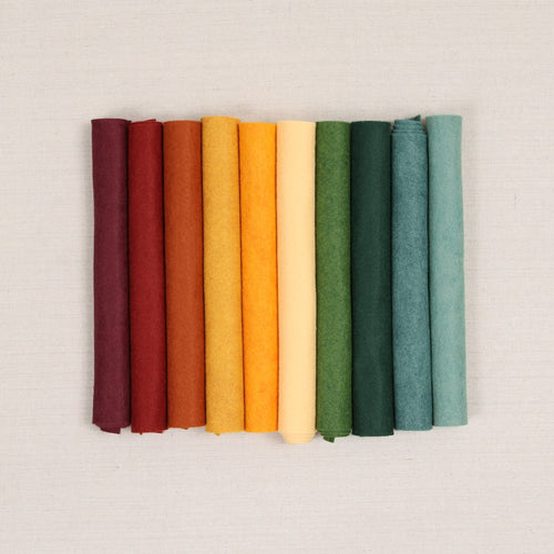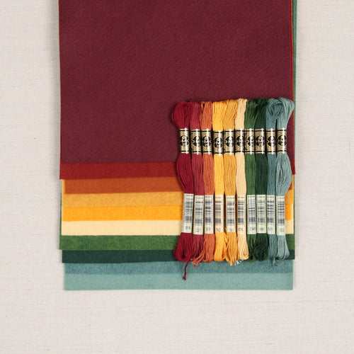Filled with limited edition colors -and inspired by autumnal wildlife - this palette includes ten sheets of wool blend felt in Burgundy, Crimson, Lucky Penny LE, Amber LE, Midas LE, Foxtail LE, Meadow, Evergreen, Turquoise, and Blue Spruce. Grab additional felt sheets of the limited edition colors! Coordinating DMC embroidery floss is also available.
