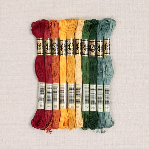 Includes ten colors of DMC six strand embroidery floss. Includes colors inspired by our wool blend felt colors in Burgundy, Crimson, Lucky Penny, Midas, Amber, Foxtail, Meadow, Evergreen, Turquoise and Blue Spruce.