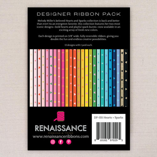 Each design is printed on 3/8" wide, fully reversible ribbon, giving you double the fun and endless creative possibilities. Whether you're adding the perfect finishing touch to a quilt, crafting accessories, or elevating your sewing projects with a pop of color, Hearts and Sparks is a must-have for every maker’s stash.