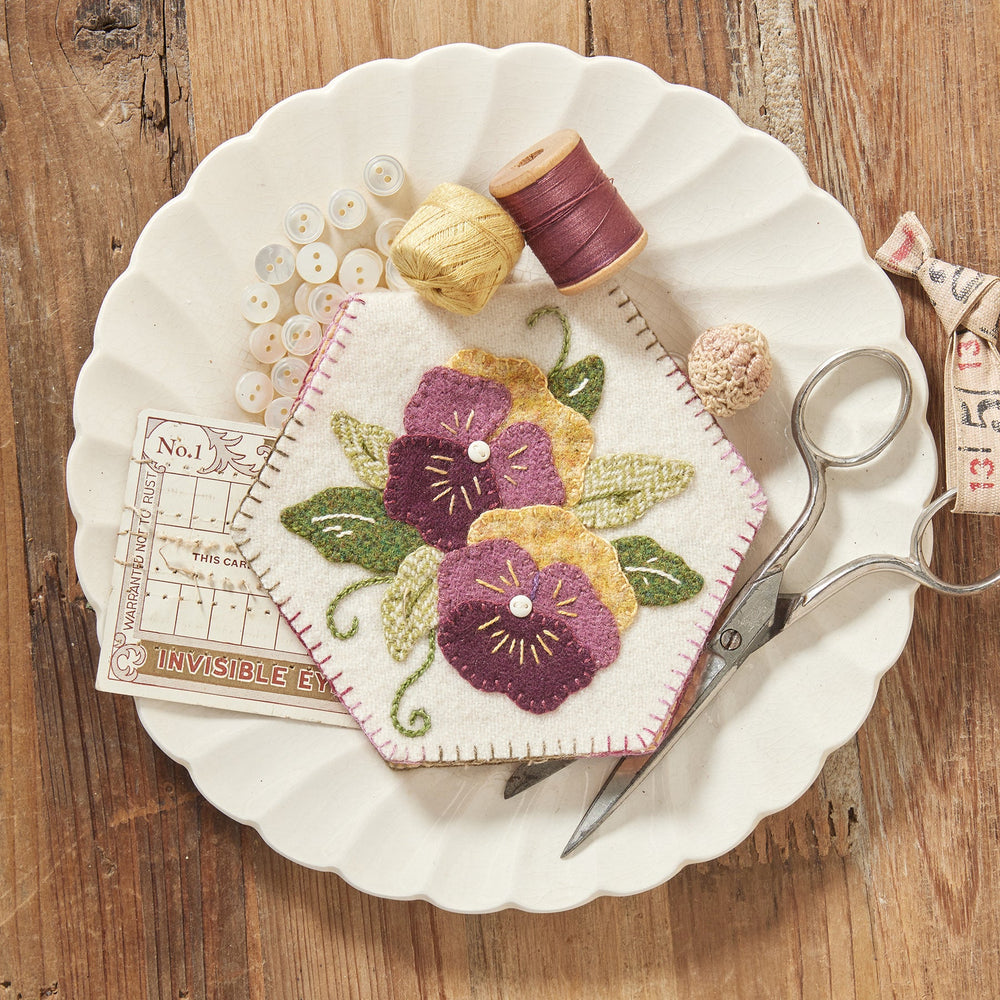 This Needle Keep Kit in a sweet spring pansy design includes a pattern, felted wool, fabric and buttons. You will need floss, fusible webbing and Shape Flex. Benzie recommends using EZ Print Lite for both! Finished size is 4.5" x 5". By Buttermilk Basin