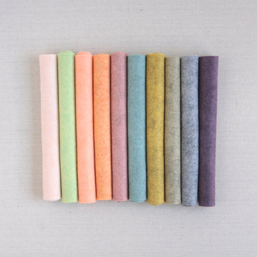 Benzie's wool blend felt in Pistachio, a lightly heathered color. Select cut sheets or yardage-multiples of 1/2 yard cuts will yield one uncut sheet. Our bolts are approximately 36" wide. Full bolts are 40% off the retail price of cut sheets. Inventory on full bolts is limited, please contact us for availability.