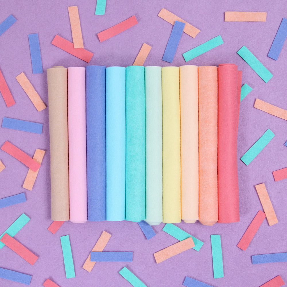 Ice cream sundaes and sprinkles! Cover up those felt donuts, pastries and ice cream cones with a pastel parlor palette. Ten wool blend felt sheets in Seaside, Pink, Periwinkle, Aqua, Julep, Mint, Lemonade, Peach, Guava and Coral. Coordinating DMC embroidery floss is also available. Photographed on Lilac (Lilac not included). Read our blog for ice cream craft (https://www.benziedesign.com/blogs/tutorials/birthday-countdown-calendar) diy!