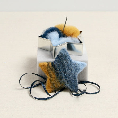 Includes everything you need to get started felting: Felting foam, felting needle, cookie cutter, wool roving, Angelina fibers and ribbon.
