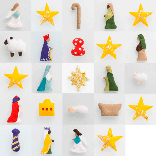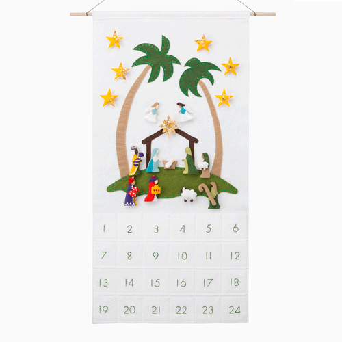 Celebrate the true meaning of Christmas with this stunning Nativity scene. Countdown to Christmas by retelling a portion of the story of Christ's birth each day of December. Pattern includes optional feature to create figure puppet ornaments your children will love. Handcraft this amazing treasure from Benzie's wool felt and enjoy this Christmas countdown for generations! Downloadable pattern includes easy-to-follow detailed instructions with full-color photographs, plus full-size pattern templates for base, numbers, & ornaments. Finished calendar dimensions are 18 inches x 35 inches.